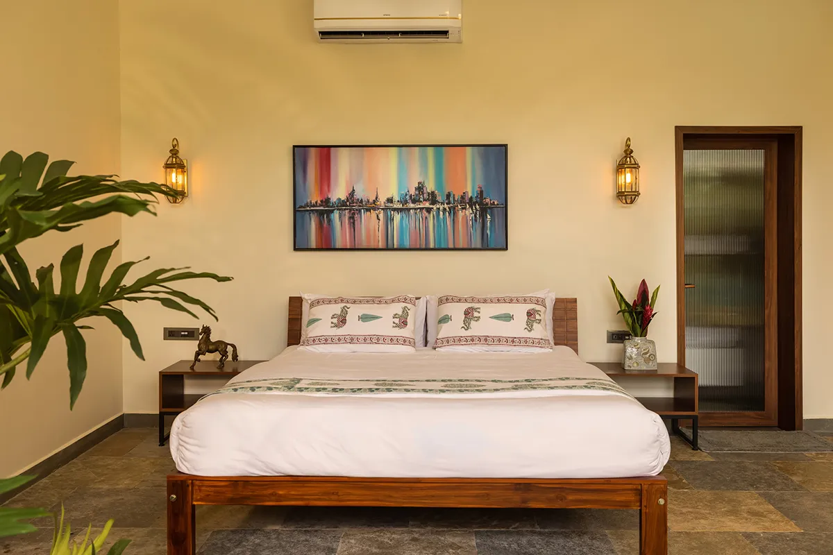 Ashoka is among our most premium family rooms, facing the pool. It features an American standard king-size bed with a queen tucked neatly below, each with its own cot. In the evenings, families can pull out the secondary bed, creating a comfortable arrangement for four without needing extras. Kota stone flooring, a skyline painting, and an open-to-sky bath add elegance and character to this space.