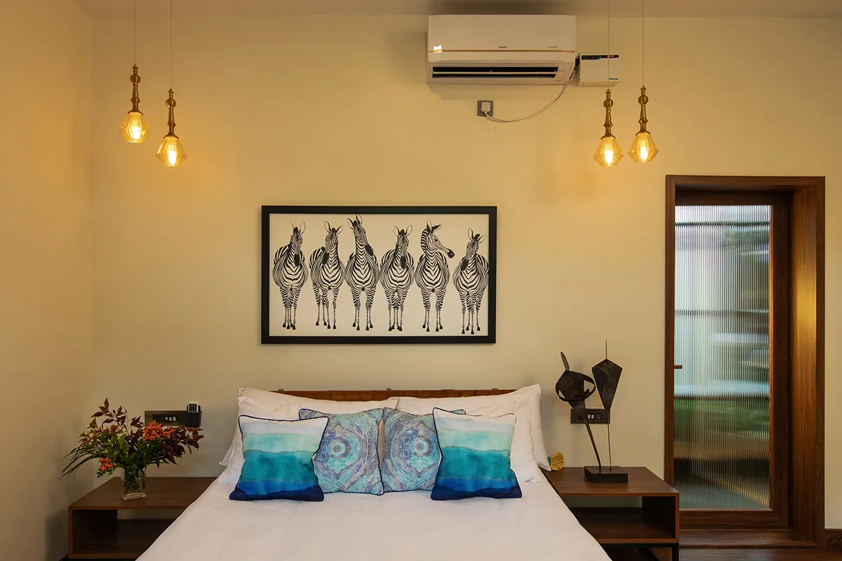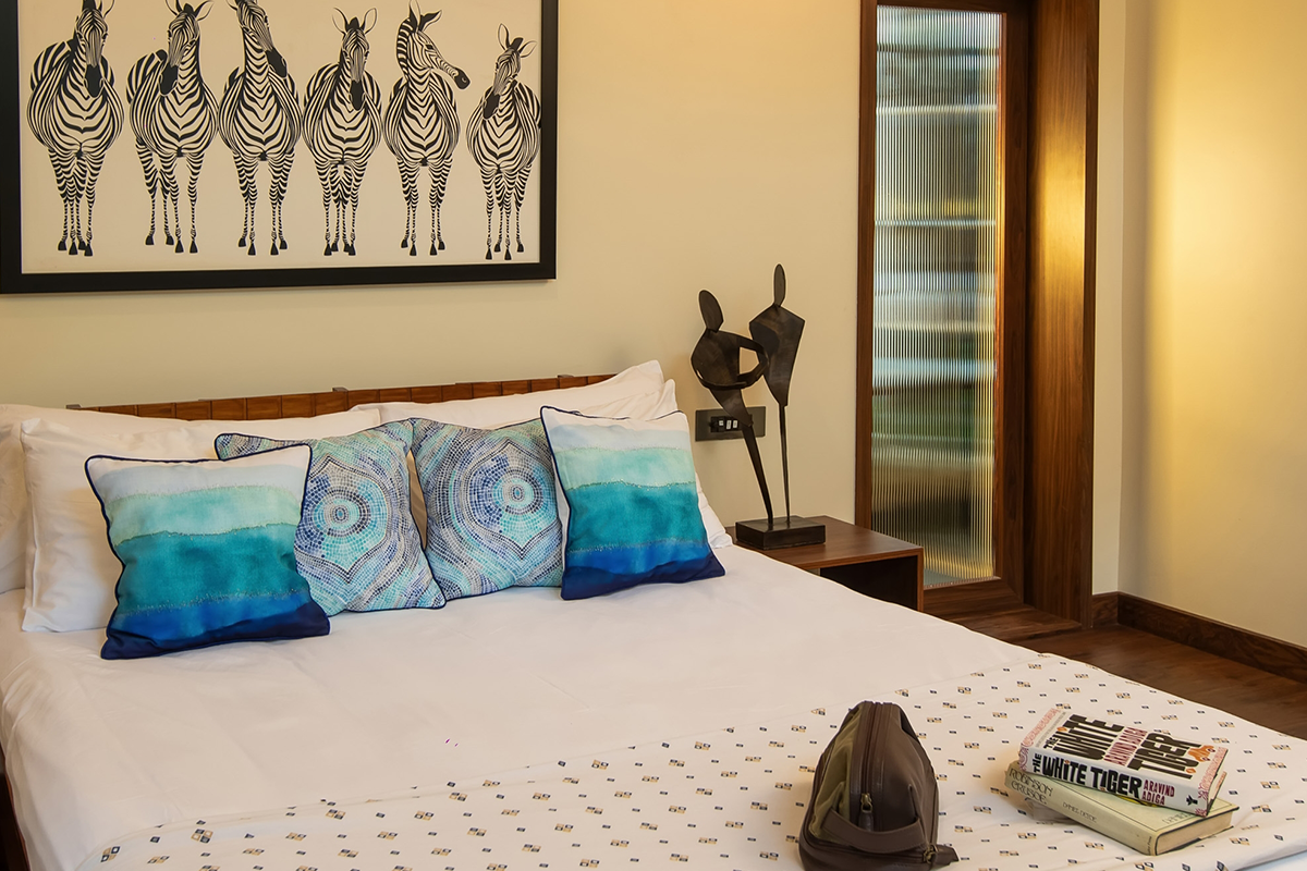 Set on the pool front, Bilva is designed as a romantic retreat for couples. Its zebra-inspired art and mood lighting create a distinctive ambiance, anchored by an American queen-size bed. Thoughtful details make it a sanctuary of style and intimacy. The room is reserved for two adults, with space to welcome an infant up to eight years old. No extra beds are permitted.