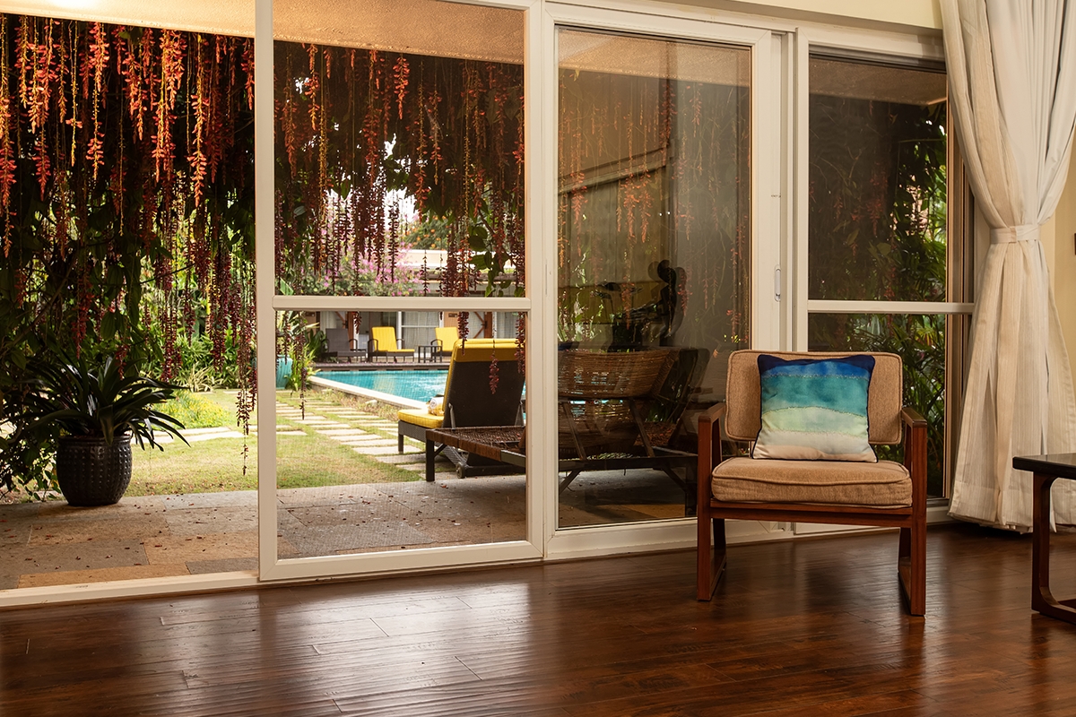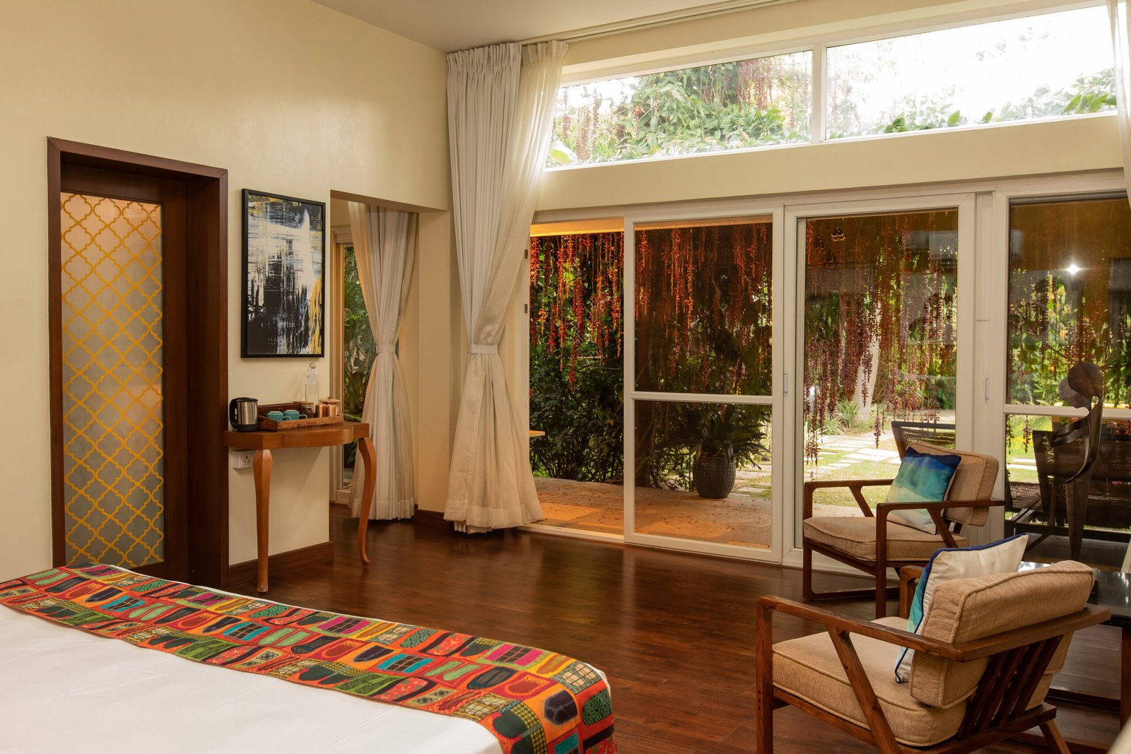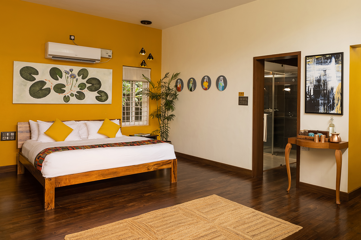 Spatika, once our guest room, has become a bright, airy retreat overlooking the pool. It features an American standard king bed with a queen stored beneath, both with individual cots. Families love the ease of pulling out the secondary bed in the evenings, creating generous space without clutter. A pergola with creepers, wooden flooring, and a walk-in wardrobe complete this elegant and thoughtful design.